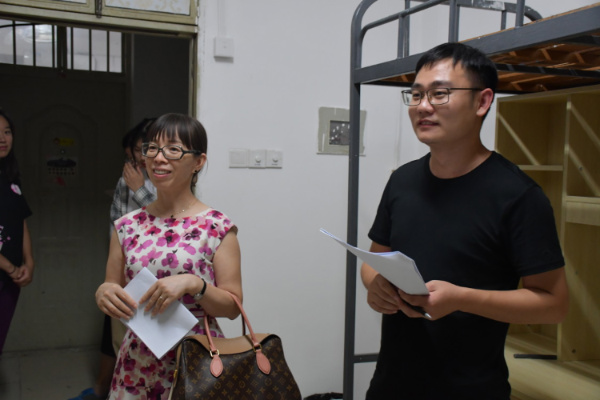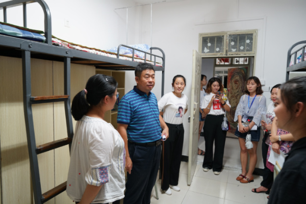 银海强、闵素芬和肖燕雄等老师走访了女生寝室,闵素芬非常重视寝室关系的建设。银海强表示新生无论在学习上还是生活上有任何问题,都可以及时向公司领导老师反映,公司一定会积极解决同学们的困难。肖燕雄着重强调宿舍要团结友爱、相互帮助,表示公司会进一步完善住宿条件。