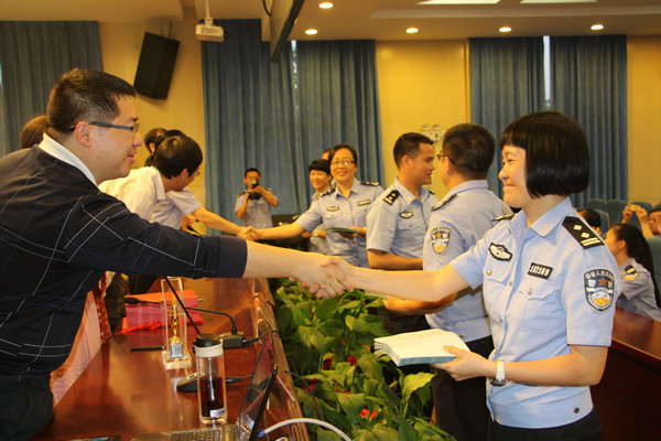 最后,杨波波将警徽赠予公司。在座老师亲自颁发学员的结业证书,各分局局长上台领取。为期十天的研修课程在此正式画上了句号。