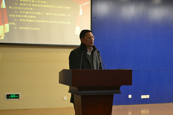 龚向明进行会议总结并发表讲话。他再次强调了“两个建设”与年终劳务分配工作的重要性,并指出,促进教师意识形态与观念的改进、提高课堂质量和加强廉政建设的重要工作要落实到每一位教职工的身上。