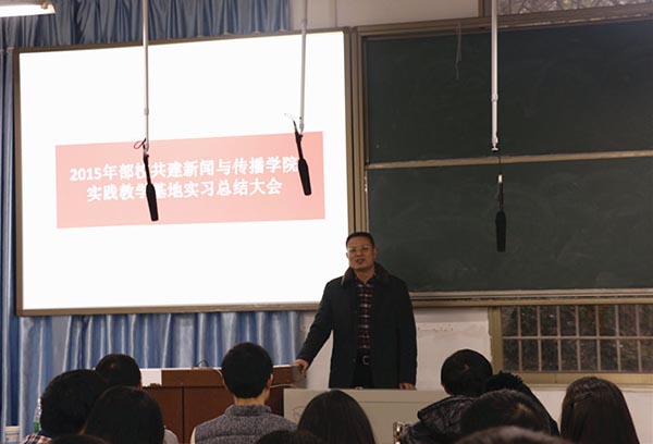 王战教授作为教师代表发言。他指出,部校共建实践教学基地受到了公司和单位的高度重视,在公司和实习单位的配合下,同学们进入了在全国有影响力的媒体实习,是难得的机会,是人生中的宝贵经验,并就实习中需要进一步注意的问题作了分析。