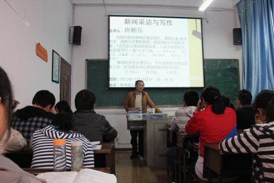 他就是光明日报驻湖南站站长,高级记者唐湘岳先生。“从业近四十年来,我只做过一份职业,那就是做记者,写稿件。”这是他的开场白,也是对自己职业生涯的简练介绍,他这些年来共发稿件两千余篇,曾登上光明日报头版头条两百余篇,六次获得中国新闻奖。这样一位在同学们眼中可以称得上“传奇”的名记者,从职业理想,专业素养等方面与同学们展开长达两个小时的交流。