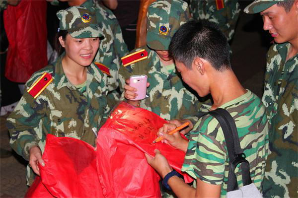随后,张磊和新生代表一起在江边放飞象征希望和祝福的孔明灯。百灯齐放,烟花绚烂。每一位新生都在上面写下自己对家人朋友的祝福、大学的期待以及军训的感受。红色的孔明灯犹如漫天的星光,伴随着美丽的烟花缓缓升入夜空。