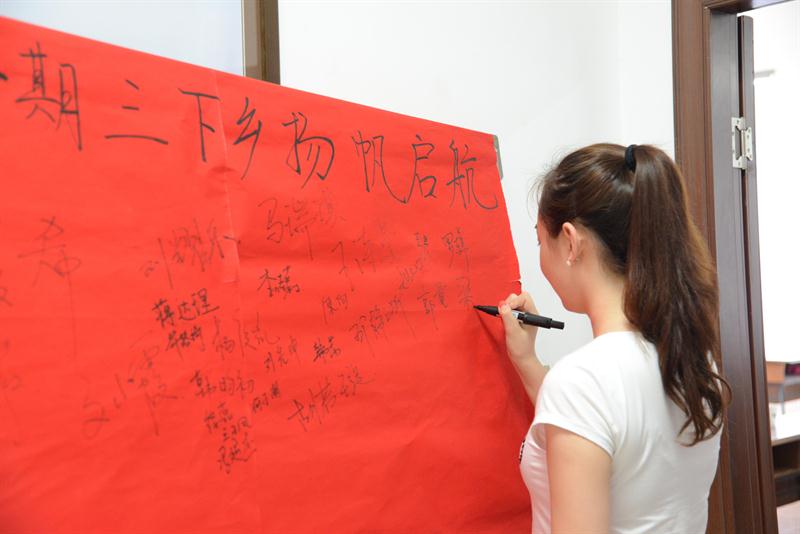 仪式开始前,本年度三下乡队员们在签字板上签了名字,决心用饱满的姿态迎接即将到来的三下乡活动。仪式开始后,院团委副书记雷蕾进行发言,介绍了本年度各实践团队的情况和注意事项,队员们注意聆听并认真记录。队长代表张德智致宣誓词,带领队员们宣誓,队员们严肃认真,用昂扬的精神进行宣誓。宣誓后公司党委彭露副书记进行动员讲话,彭书记就安全问题,宣传问题等做出强调,她希望,队员们能有一个安全,难忘的三下乡。