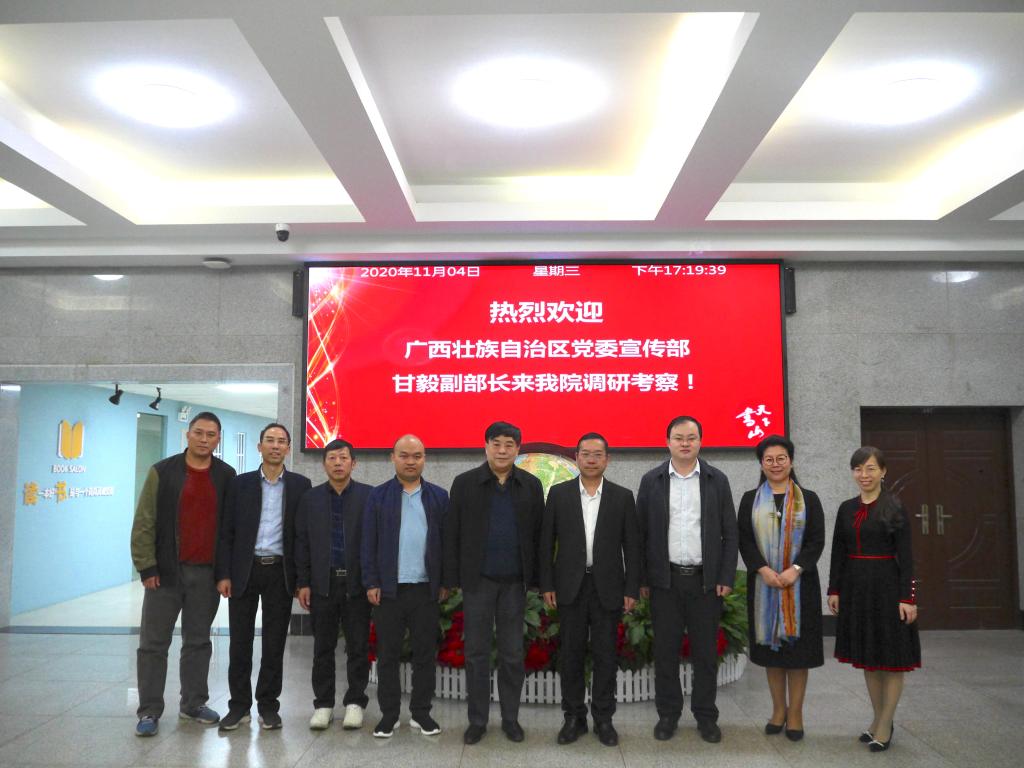 (通讯员 肖菲宇)11月4日下午,广西壮族自治区党委宣传部副部长甘毅一行四人来公司考察交流。座谈交流会在公司二楼会议室举行,会议由公司党委书记李正益主持,湖南省记协副秘书长邓彪,广西壮族自治区党委宣传部新闻处主任科员余雄,广西民族大学主任播音员杨学明,经理尹韵公,副经理周国清、闵素芬,部校共建联络员单文盛出席会议。