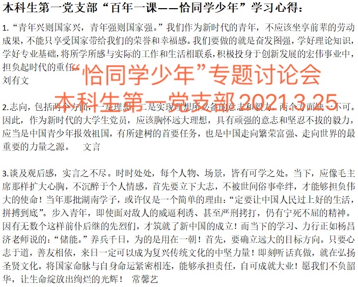 全体党员认真学习了习近平总书记在党史学习教育动员大会上的重要讲话精神,按照公司和公司的安排,观看了“就认这个理——百年一课《恰同学少年》”专题片,接着展开积极地讨论,并撰写学习心得。