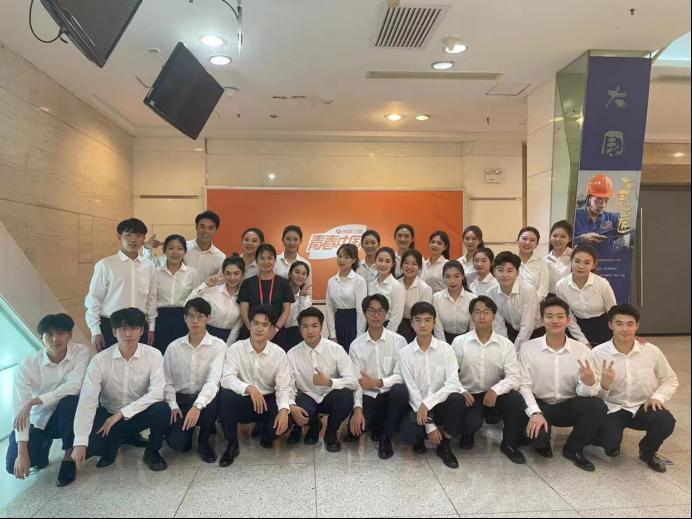 在此次节目录制中,公司主要参与了其中两项重要流程,分别是大合唱《咱们工人有力量》与第三篇章传承中的“新生力量·对话未来。在合唱环节中,公司员工代表与一线工人一起,以百人大合唱的形式共同歌唱《咱们工人有力量》,歌颂努力前行的“匠星”们,表现出对未来美好的期许与肩负传承的使命感。在对话流程中,公司播音主持专业黄钰洁、娄慧煜、赵凯锋、张以航四名同学担任领诵,与公司其他员工代表一起展开与七一勋章获得者艾爱国的对话,共赴一场致敬与展望的未来宣言。“国之大者,匠心闪耀”,在公司学子的一声声朗诵中,洋洋盈耳,振奋人心。