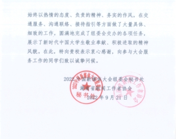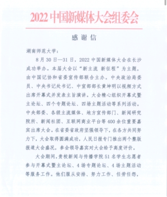 (通讯员 龙江乐 常心怡 于蓉)8月30日至8月31日,2022中国新媒体大会于长沙成功举办。近日,2022中国新媒体大会组委会致信向公司表示感谢。