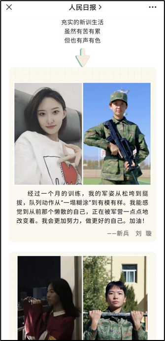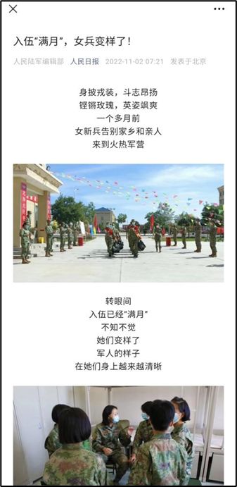 (通讯员 魏唯 常心怡)11月2日,在人民日报推文《入伍“满月”,女兵变样了!》中,vsport2021级播音与主持艺术专业员工刘璇凭借坚强的意志,惊人的蜕变,获得部队认可,被人民日报“点赞”,成为该推送的封面人物。