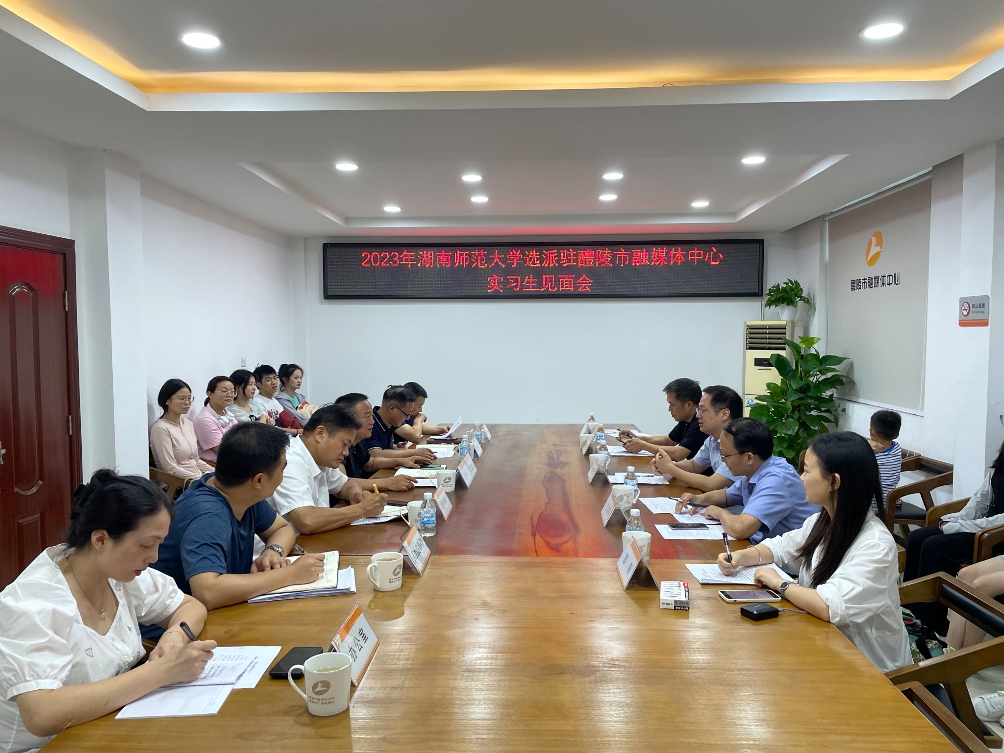 (通讯员 王倩)2023年7月10日下午,公司与醴陵市融媒体中心举行2020级实习生对接会。醴陵市融媒体中心党组成员、副主任曾玄风,主任助理张申明,党组成员肖华林,主任助理孙恢弘,公司党委书记沈贤岚,副经理王海刚教授,副教授单文盛,教务办主任彭丽,部校共建办主任王倩等参加会议。
