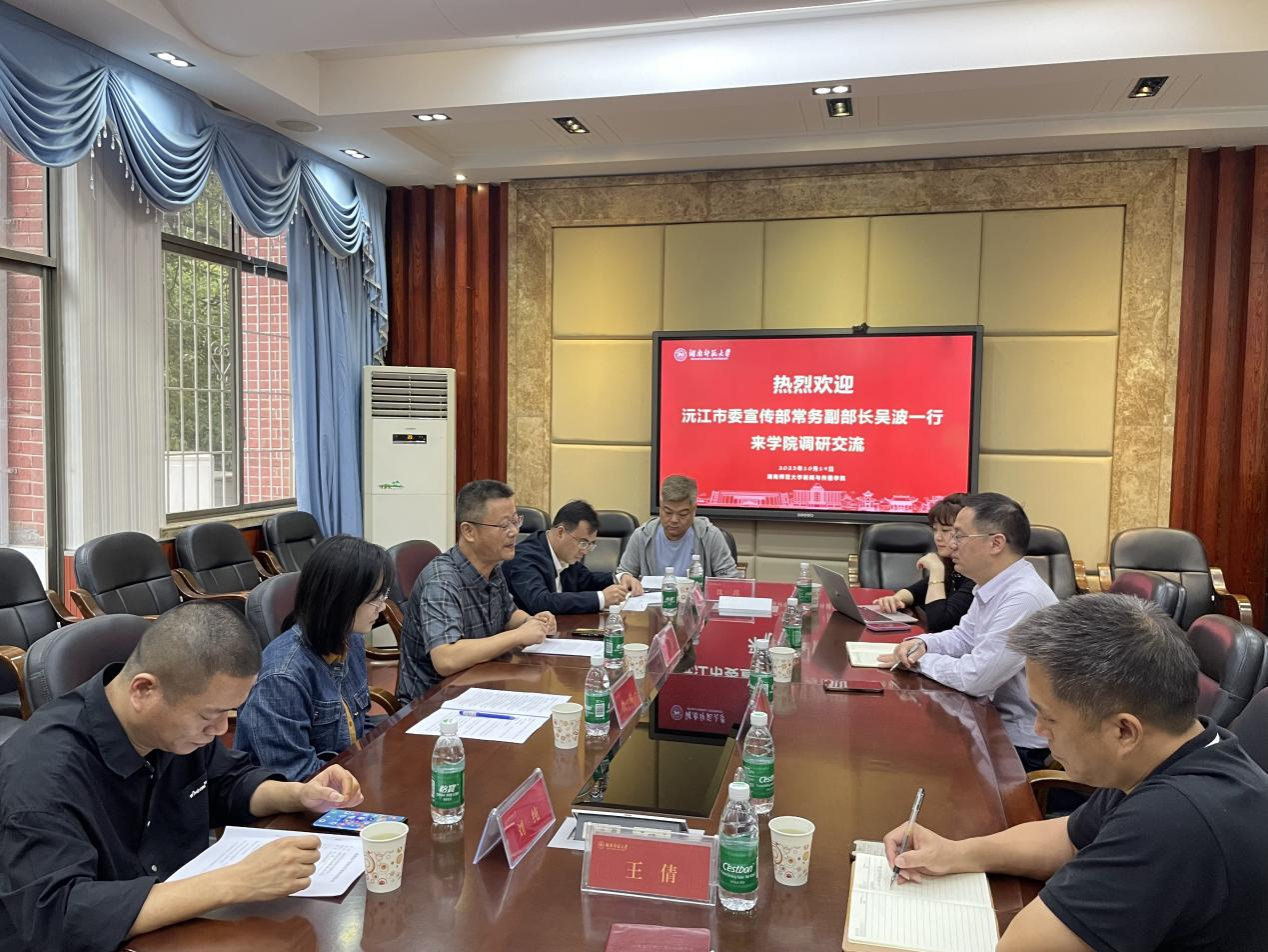 (通讯员 王倩)为加强校媒深度合作,探索建立高校与地方党媒协同育人机制,大力培养全媒体人才,讲好湖南故事,传播湖湘文化。10月19日上午,沅江市委宣传部常务副部长吴波,沅江市融媒体中心主任胡增荣一行五人前来公司调研交流,公司党委书记沈贤岚、县级融媒体建设研究中心执行主任方提教授等参加会议。