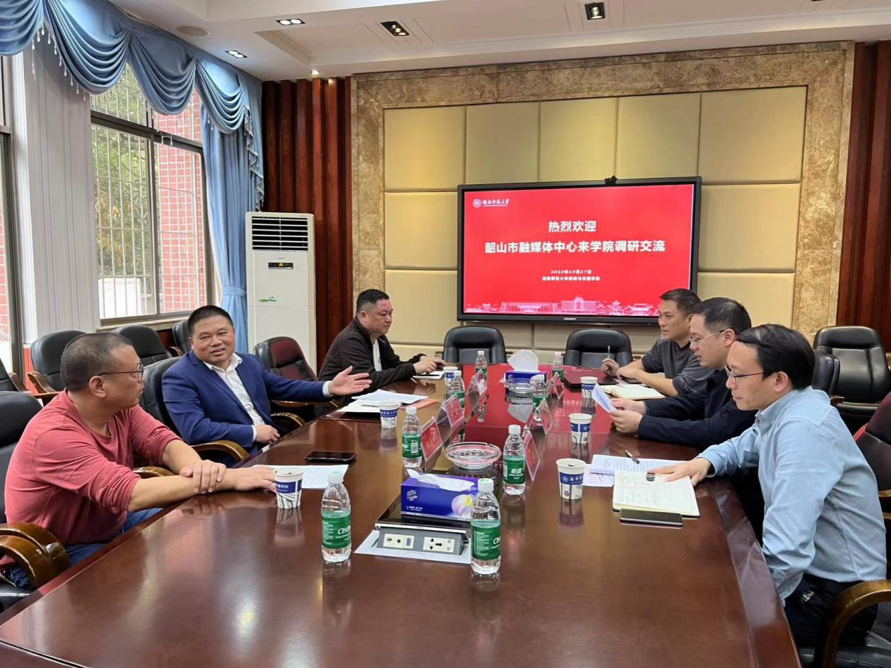 (通讯员 魏子煊)为加强校媒深度合作,探索建立高校与县级融媒体协同育人机制,讲好湖南故事,传播湖湘文化。10月27日上午,韶山市融媒体中心主任谭胜,副主任阳泽平,总编室庞波文一行三人来公司调研交流,公司党委书记沈贤岚、副经理王海刚教授、单文盛副教授参加会议。