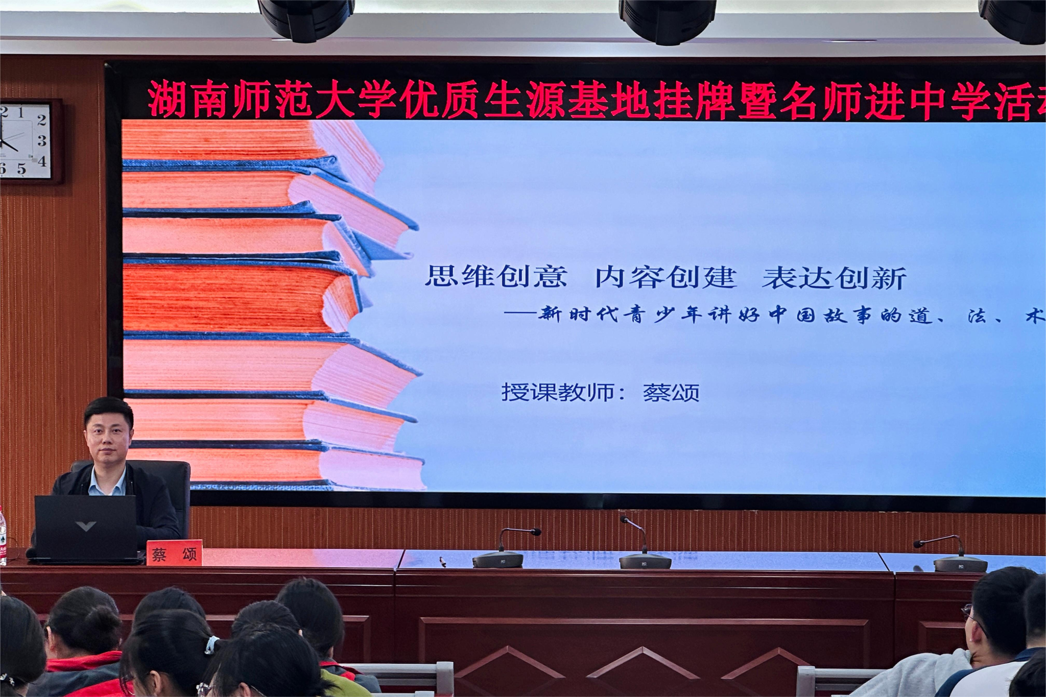 授牌仪式结束后,蔡颂教授为宁远一中学子做《思维创意、内容创新、表达创新——当代青年讲好中国故事道、法、术》的主题讲座。“讲好故事,事半功倍。”讲座结合语言学、传播学、艺术学等相关学科知识,从思维创意、内容创建、表达创新三个方面,引导大家在掌握“讲好中国故事的道、法、术”之基础知识及实践技能的同时,切实提升“语言”“思维”“审美”“文化”四个维度的核心素养。他指出,作为新时代的青年,应当肩负起传承和弘扬中华文化的重任,通过创新思维和创意表达,将中国故事传递给更广泛的受众。他分析了当前中国故事的传播现状和存在的问题,提出了思维创意、内容创新、多元化表达的必要性。他鼓励员工们打破传统思维模式,通过批判性思维发现新的观点和见解,深入挖掘中国文化的深层内涵,将其与现代元素相结合,创作出具有时代感和吸引力的故事内容。蔡颂教授鼓励员工们将所学应用于实际,积极参与中国故事的传播工作,为提升国家文化软实力贡献青春力量。