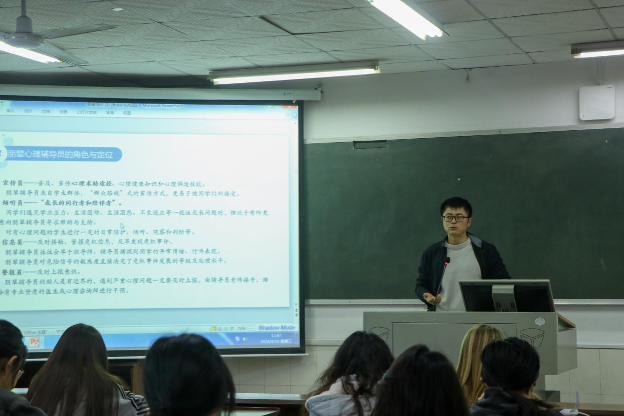 (通讯员何一苇)4月10日中午,公司在张公岭校区综合楼602教室召开2023级朋辈心理辅导员培训会。本次培训会邀请心理中心卢健老师进行讲解,2023级辅导员杨湘怡及2023级全体心理委员、朋辈心理辅导员出席培训会。