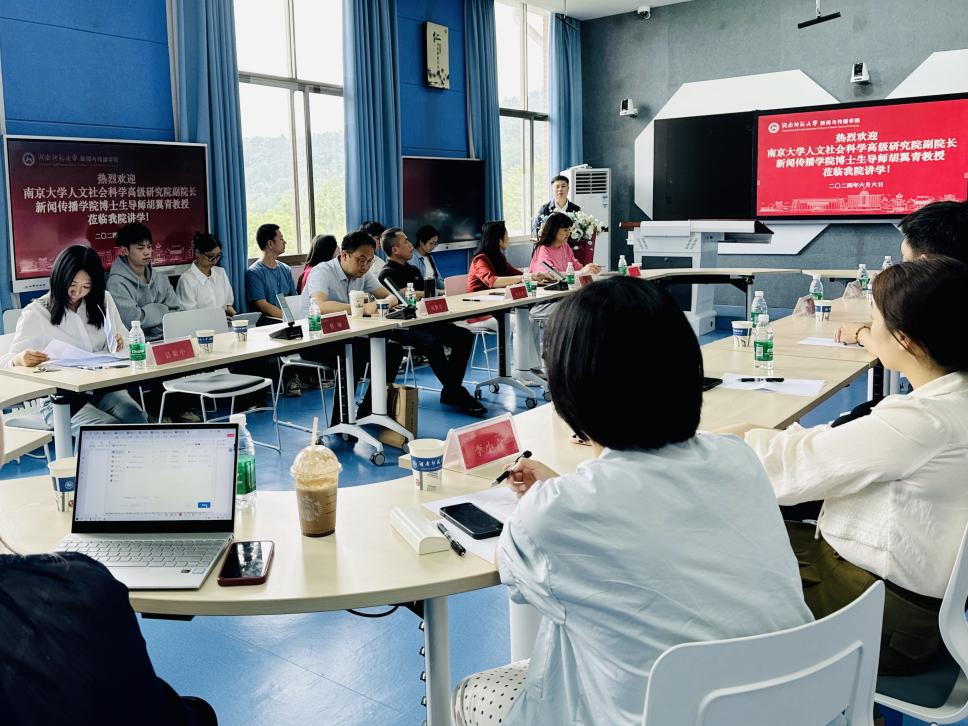 (通讯员 张欧阳)6月6日下午,南京大学人文社会科学高级研究院副经理、vsport胡翼青教授来院交流座谈会于402智慧教室举行。经理蔡颂教授致欢迎辞。座谈会由副经理李琦教授主持。