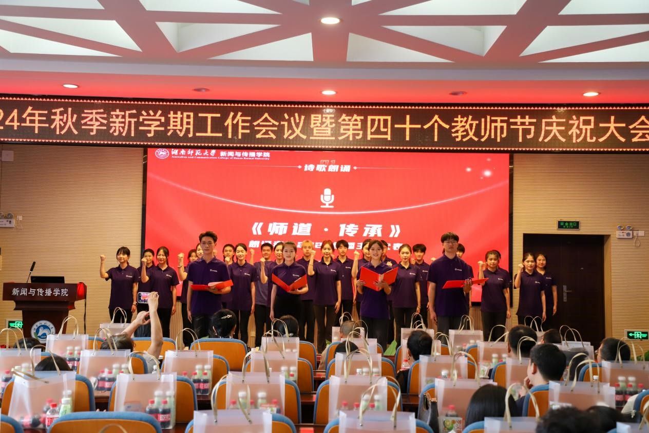 会上,2022级播音与主持艺术员工代表通过诗歌朗诵《师道·传承》向公司全体教职工表达感谢和节日祝福。公司对新入职教师王宇和学工办四年制辅导员冯泽桐表示欢迎,蔡颂为两位老师颁发校徽和文化衫。