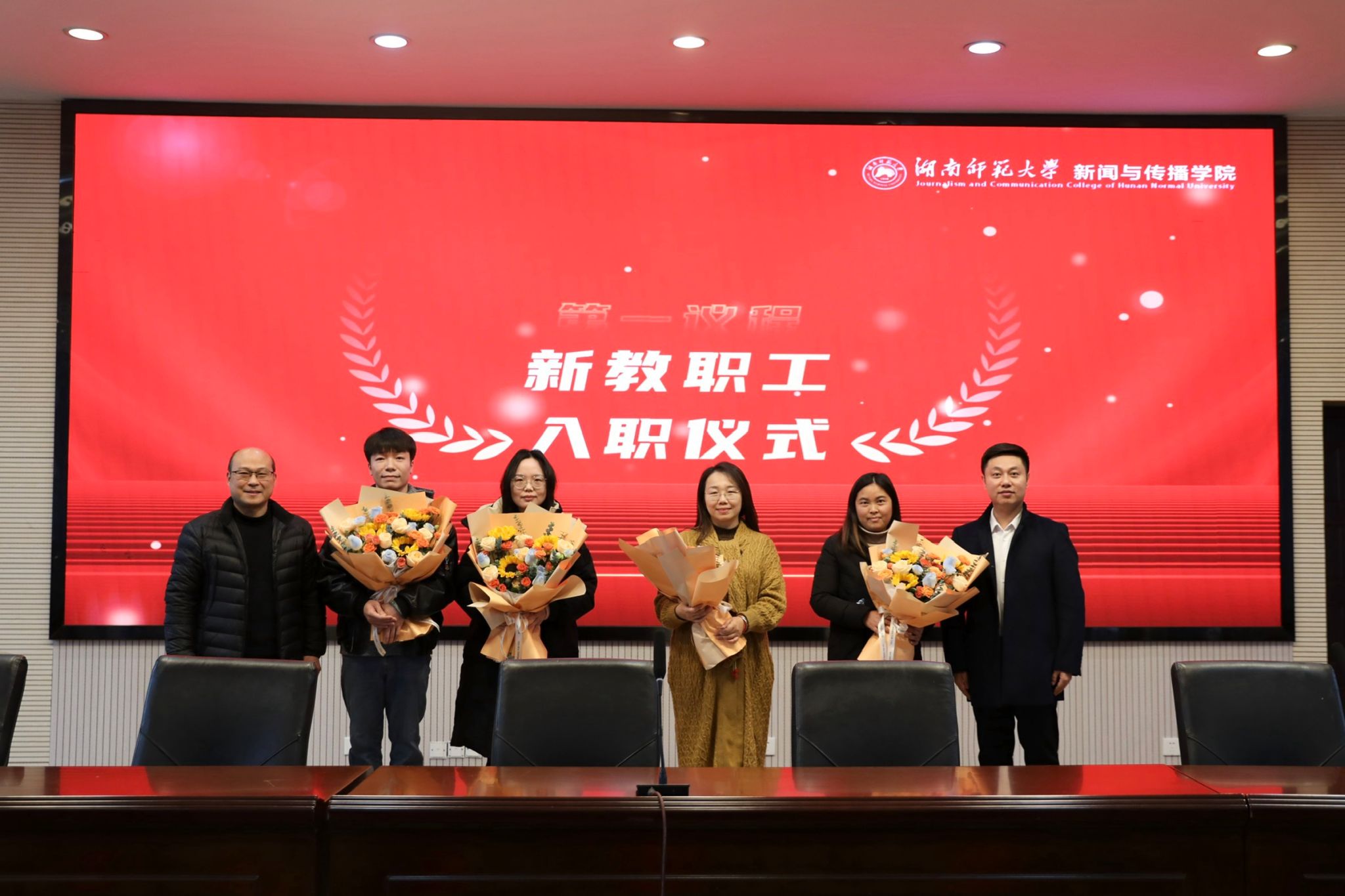 会议举行新教职工入职仪式,蔡颂和李泳波为周霞、贺敏、曾哲扬和蒋美云4位新进教师献花欢迎。