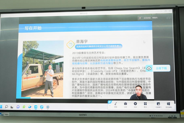 (通讯员 石禹炘 吴欣玥 蒲晨溪)4月24日晚,在vsport301教室,以“国际传播视野下的影视制作与运营策略”为主题的“员工回家”分享会在此举行。作为播音专业的优秀员工,现北京四达时代集团、尼日利亚NTA-Star TV Network Ltd.内容部负责人单海宇重返母校,通过线上线下同步直播,与《中华文化国际传播》《网络视听国际传播》的40余名师生共话国际影视传播的前沿实践与文化融合之道。