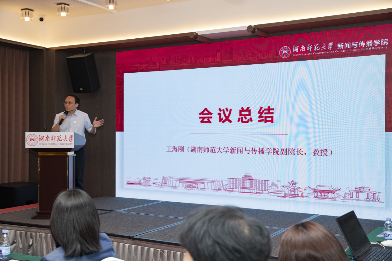 副经理王海刚教授对本次研讨会做了简要的总结,他介绍了公司新闻传播人才“1314”培养模式,期望湖南、湖北新闻传播院校之间加强交流合作,推动新闻传播公司产品改革,努力建设新闻传播学术共同体,为加快构建中国新闻传播学自主知识体系贡献智慧和力量。