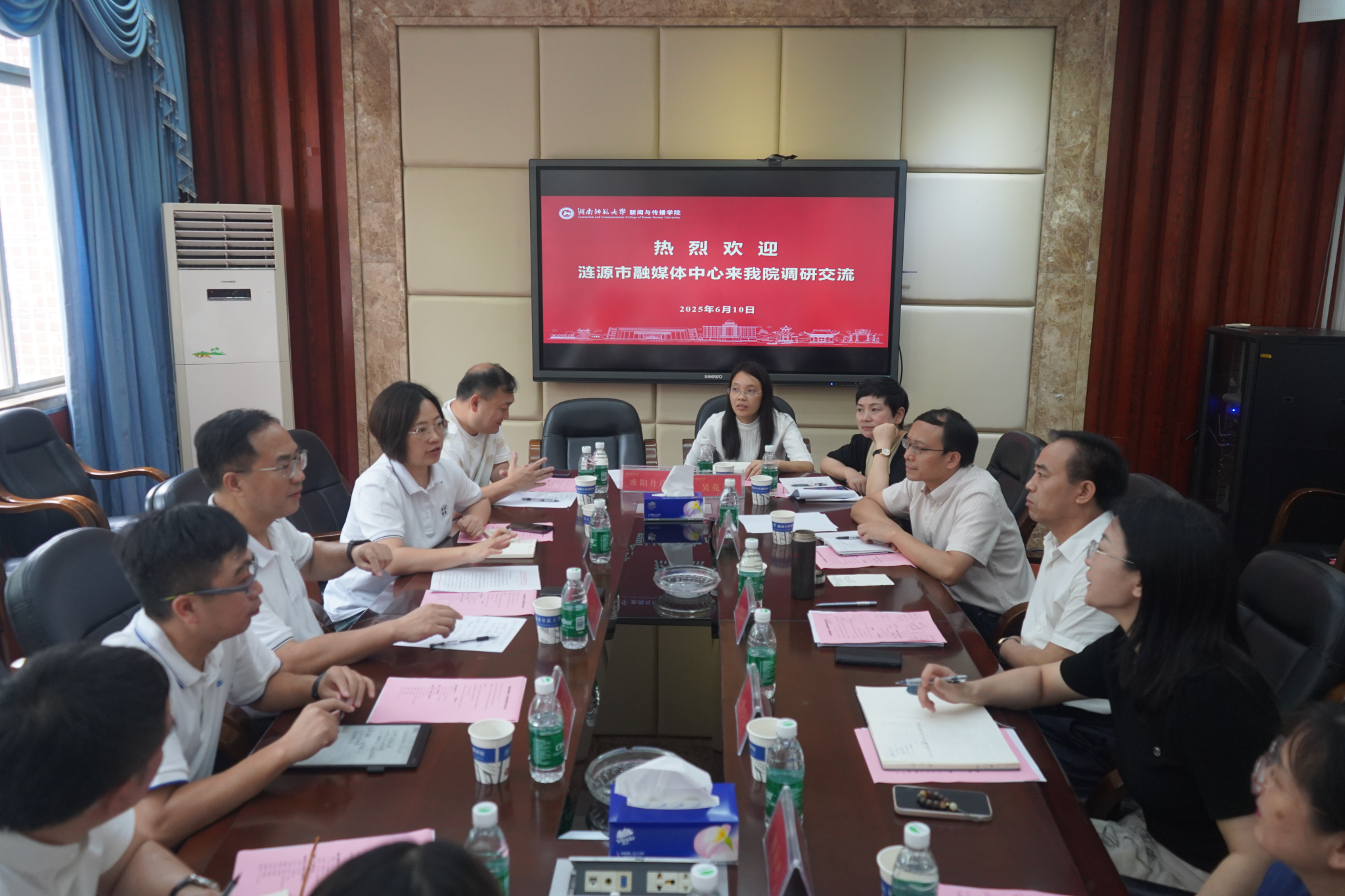 (通讯员 刘可心 化曼村)为促进校媒共融共建共享,6月10日上午,涟源市融媒体中心来新传院调研交流,座谈会于新传院二楼会议室展开。调研会由公司党委副书记张小春主持。公司党委书记王胜章,副经理、编辑出版系主任王海刚,播音与主持艺术系主任颜湘君、教师刘玮娜,新闻系教师陈艳辉、编辑出版系教师吴亮芳、广告系教师单文盛等参与本次调研交流会。