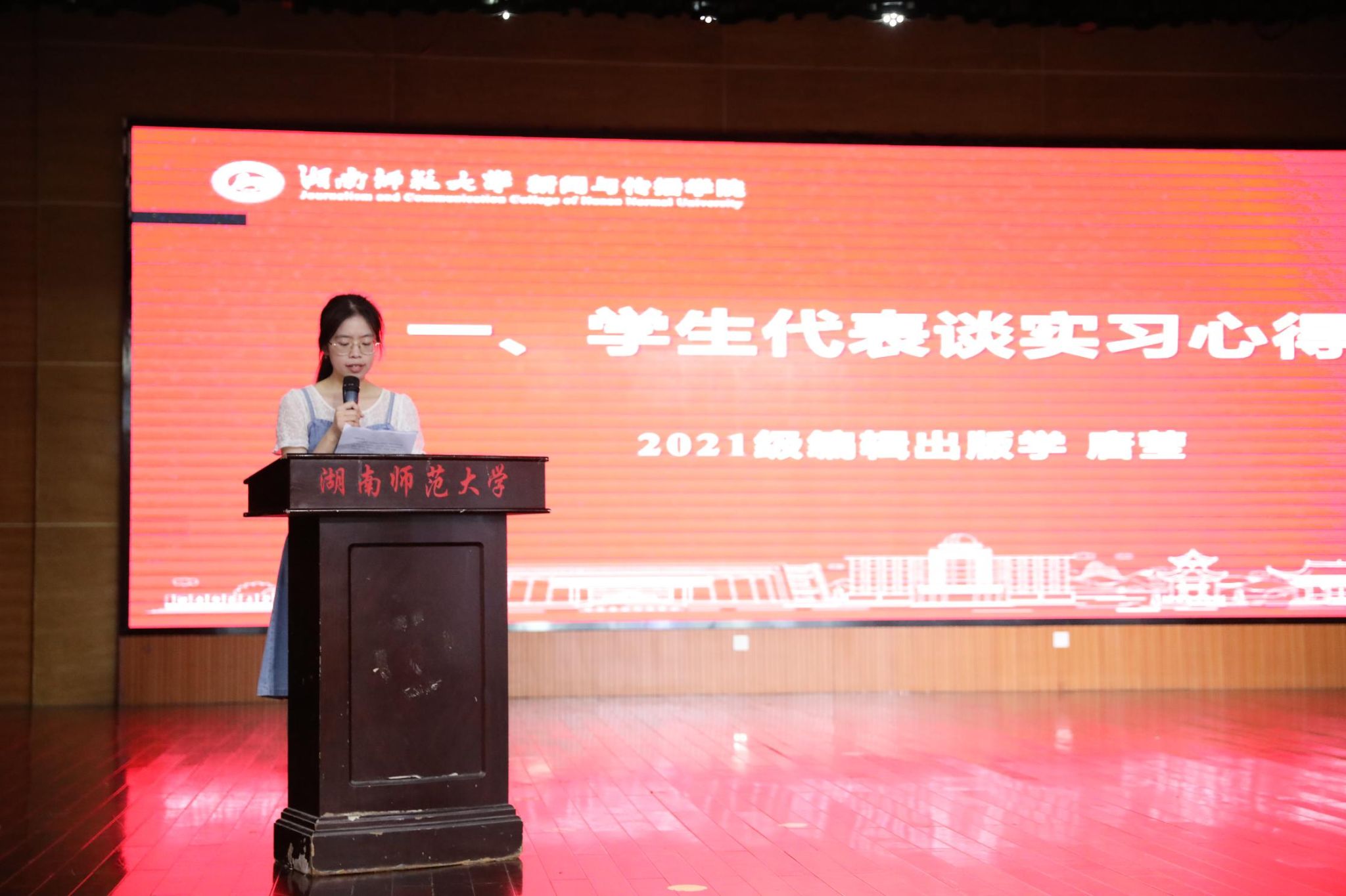 2021 级编辑出版学专业唐莹同学作为员工代表上台分享实习心得。她以自身经历为切入点,深刻阐释实习是专业知识与行业实践的深度碰撞。她鼓励学弟学妹们在实习中完成从员工思维到职业身份的认知转变,尤其要注重锻造符合行业需求的硬核技能,以适应未来职场新挑战。
