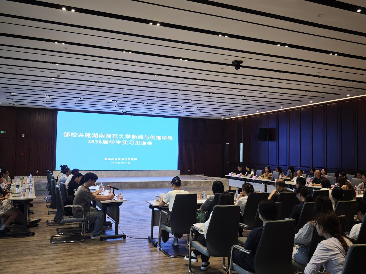 7月15日上午,公司与湖南出版投资控股集团有限公司举行2026届员工实习见面会。湖南出版投资控股集团党委副书记、副董事长、总编辑、总经理杨壮,中南出版传媒集团股份有限公司总编辑谢清风,集团组织部部长文依平,集团党委宣传部部长佘璐,集团党委宣传部主管吴幸倬,公司党委书记王胜章,副经理王海刚,广告学系主任曾琼教授,编辑出版学系副教授吴亮芳,教务办主任彭丽,部校共建办主任王倩等参加了会议。湖南出版投资控股集团党委宣传部部长佘璐主持会议。