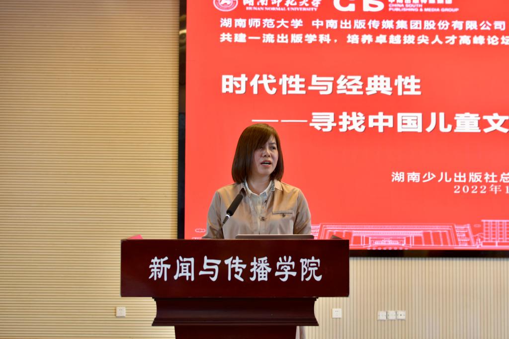 湖南少儿出版社总经理、总编辑吴双英发表题为《时代性与经典性—寻找中国儿童文学作家笔下的“金蔷薇”》的主题报告。她认为,打造服务这个时代所需要的精神读物,一是推出更多时代精品,做强儿童文学产品线。二是培养儿童文学作家队伍,构建儿童文学出版生态。三是培养专业的儿童文学编辑出版人才。四是打造出版、教育共同体,推动创作、出版、研究、教育的紧密合作,共同繁荣。