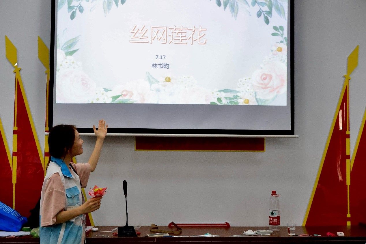 (通讯员 鲍秋彤 张耀丹 罗锦峰)7月17日,vsport“智传乡韵”暑期社会实践团在岩板铺村委会开办丝网荷花手工美育课程。此次活动旨在提高乡村员工的动手能力,增进员工对岩板铺村旅游业的了解。