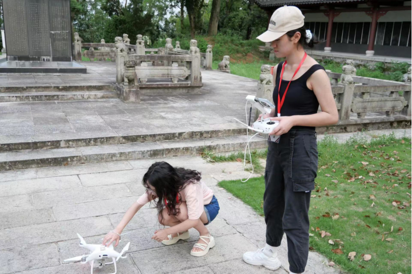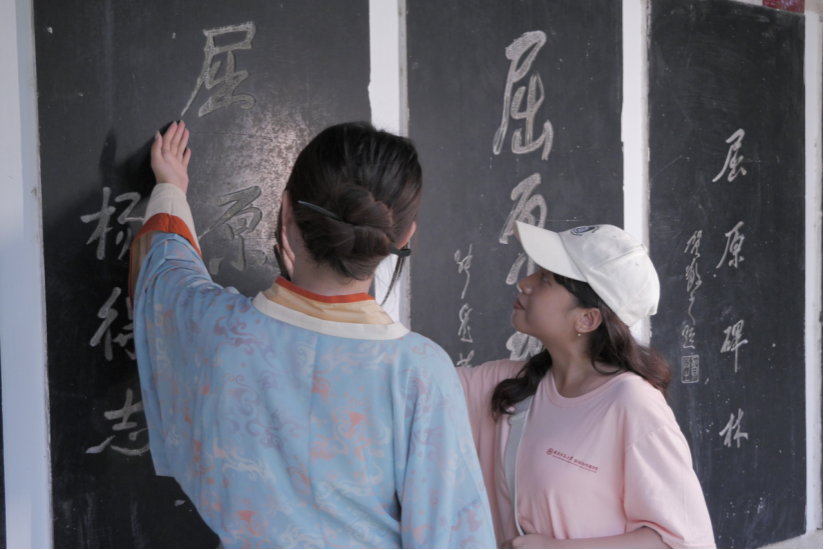 团队成员以无人机镜头记录屈子文化园全景,将湖光山色及古朴建筑生动呈现,使得拍摄视角更加立体,提升了屈子文化园的视觉影响力。随后,主持人向印度尼西亚籍研究生介绍屈原。站在屈原碑林前,印度尼西亚籍研究生抚摸石碑,朗读诗词,感念屈原九死未悔的赤子之心。