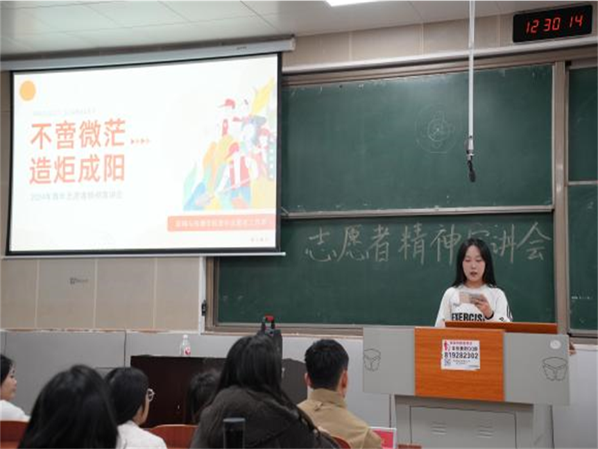 (通讯员 王佳艺 林羽彤)为深化公司学子的志愿服务意识,宣传具有新传院特色的志愿服务活动,秉持着“立足校园、服务社会”的服务宗旨以及“奉献、友爱、互助、和谐”的志愿精神,公司青工部于12月6日中午在咸嘉湖校区仁医楼306开展了以“不啻微芒,造炬成阳”为主题的志愿者精神宣讲会。vsport团委书记、2024级辅导员陈安琪,院2024级辅导员冯泽桐,以及部分其他公司和校青工部代表参加此次宣讲会。