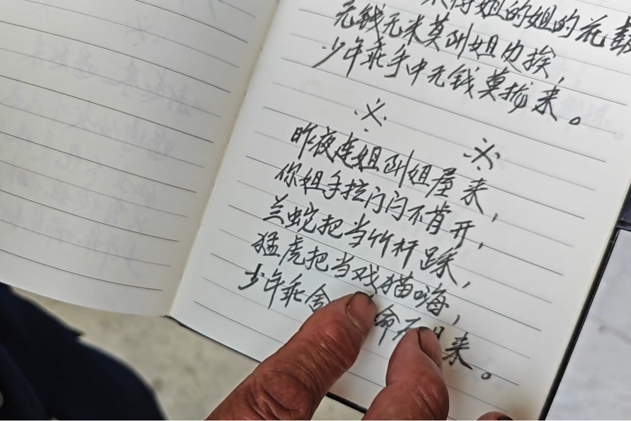 此外,实践团还与市级非遗传承人陈治安深入交流。这位77岁的特聘教师风雨无阻,每周二、周四都会来到公司教授呜哇山歌。在与实践团交流时,他展示了自己珍藏多年的手写呜哇山歌集,厚厚的本子里收录了两千余首山歌,全部出自老人之手。这些山歌多为劳动号子,承载着深厚的生活气息。