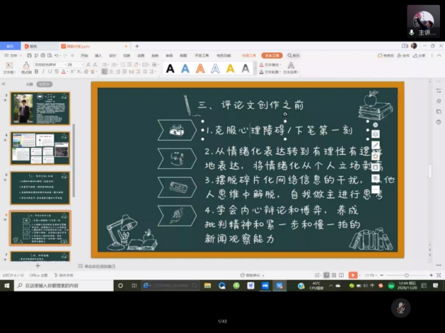 此次讲堂中,陈雅婧学姐先做了自我介绍分享一路上学习写作评论文的感受以及新闻先生新闻小姐大赛的参赛经历。青椒计划的作品分为文字类漫画类视频类文字类体裁为新闻评论,要求有思想、有个性、有时效,文字干净,逻辑清晰。随后,她着重讲述了评论写作的知识储备不仅要输出,也要输入。要寻找简单并怀疑它,寻找复杂并使之有序其次,要养成建立自己资料库的习惯。最后,学姐强调了评论能够给我们带来什么以及理想能够让人走得更出类拔萃并表示希望有更多同学能够学会评论写作、勇敢表达。