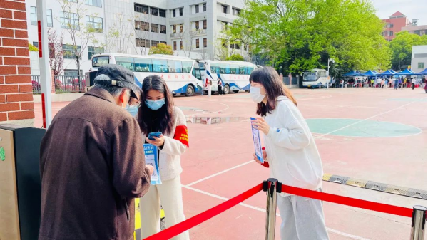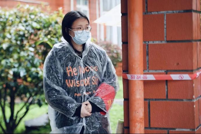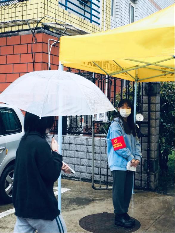 “一大早医护人员和志愿者们就到达了场地,大家都热情的、齐心协力的做好了准备工作。雨衣、鞋套、语言的关怀和行动上的互助让这个雨天也变得温暖起来。天马园区的同学都很积极配合,最深刻的是在我工作时有位同学送我一包纸以免弄湿衣裤,这便是志愿的意义与收获之一吧。”