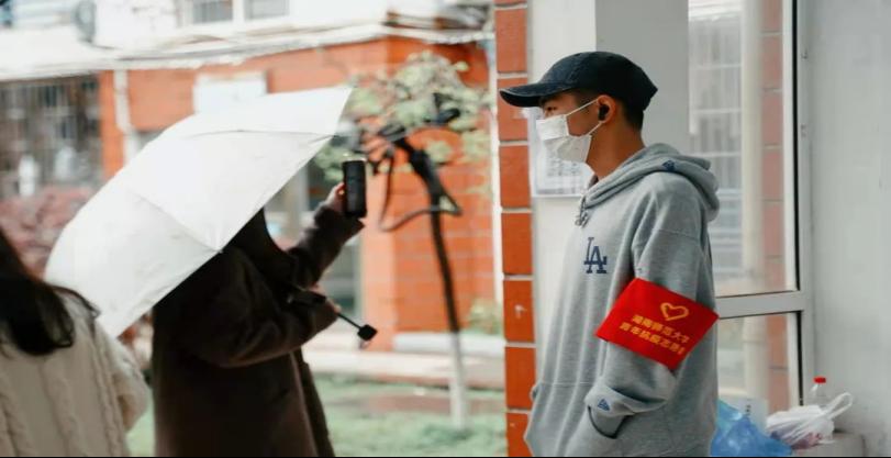“阴雨天气给核酸检测工作增加了不少难度,为了分散聚集排队的同学,我的任务就是引导同学们有序入场,及时分流人群,避免聚集,维持现场秩序。一上午的志愿工作,虽然辛苦,但是值得且有意义。不仅见证了身穿防护服的医务工作者的辛苦,也深切感受到我们新传志愿者的齐心协力,协助医护人员完成采样工作。天气阴冷,但心却温暖。相信我们能早日战胜疫情,出门拥抱春日的暖阳和浪漫。”