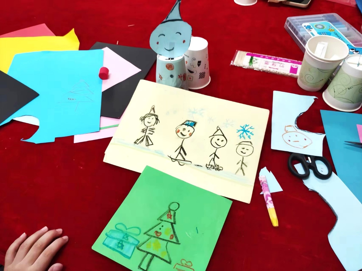 志愿者于上午8:30准时抵达廖家湾社区,在社区工作人员的安排下与孩子们一一配对。活动内容主要为手工制作,在开展过程中,志愿者们循序渐进地引导孩子,以保证制作安全。结合绘本阅读的形式,孩子们先了解立冬节气伴随的天气变化以及自然界中的生命规律,而后进行纸杯雪人的手工制作。活动中,志愿者引导孩子们独立思考与设计,孩子们也与志愿者们互动,一起分享自己的奇思妙想。