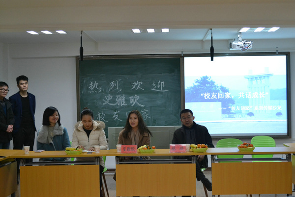 史雅欣以自己的个人经历为线索,从求学、读研、应聘及创业四个方面与在座同学进行交流。求学路上,她专心舞台,以自己坚持话剧表演而得到著名相声艺术家大兵老师的教导为例,告诉同学们要坚持兴趣并为之努力奋斗;读研时,她广阅书籍,收获颇丰,从众多求职者中脱颖而出,收获工作机会。“多读书真的能使自己内涵、谈吐高一个层次” ,她呼吁大家用读书来提升素养;在介绍应聘经历时,她建议大家毕业后最好去规范的大企业就业,且学会克服内心的犹豫和不满;在讲述创业经历的过程中,她强调了要有个人想法和团队意识。她认为,能弥补市场漏洞的想法,和志同道合的同伴最为重要。