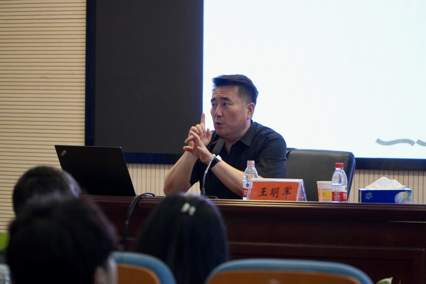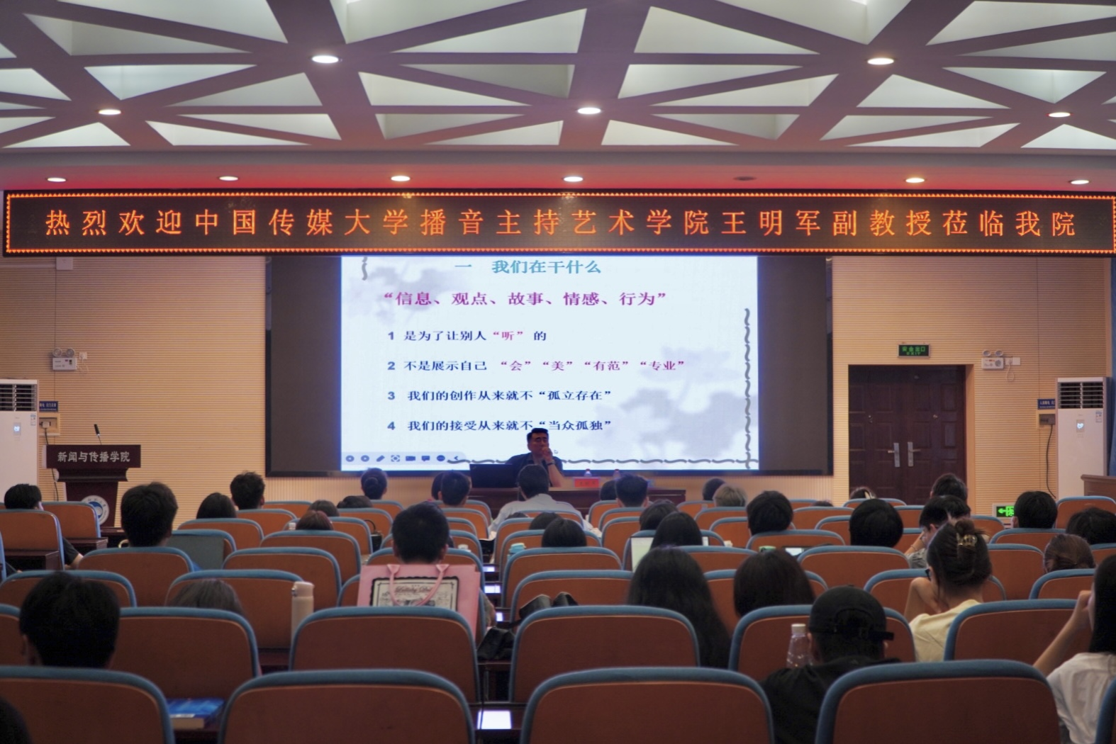 9月14日下午,王明军在vsport胜利因您更精彩vsport书山论坛开展题为《有声语言训练的底层逻辑与正确方法》的讲座。公司党委书记沈贤岚,播音与主持艺术系专业教师张丹丹、龙念、张国光、李艳、陈淼、刘玮娜、武鹏出席,系主任颜湘君教授主持本场讲座。