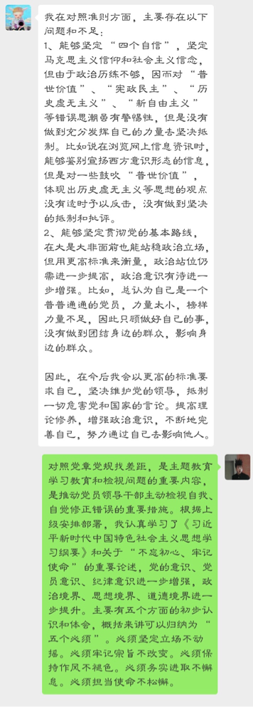 对照《准则》等,党员反思和汇报了自己近期的情况,找到与目标理想的差距。以更高的标准要求自己,坚决维护党的领导,抵制一切危害党和国家的言论,提高理论修养,增强政治意识,不断地完善自己,努力通过自己去影响他人。大家思想相互碰撞,彼此之间找差距,共同取得一定的收获。