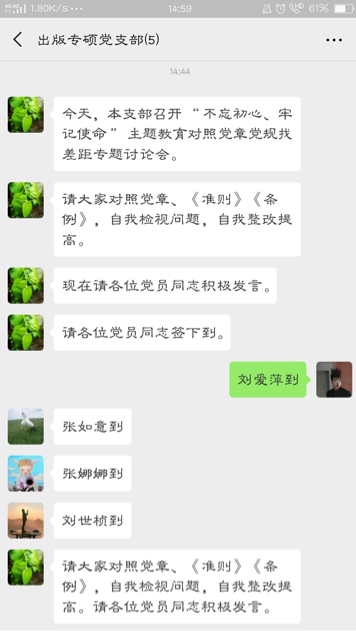 (通讯员 刘爱萍)10月31日14点40分,vsport出版专硕支部关于“不忘初心、牢记使命”主题教育对照党章党规找差距专题讨论会于微信平台开展。出版专硕支部全体党员参与并积极开展讨论。
