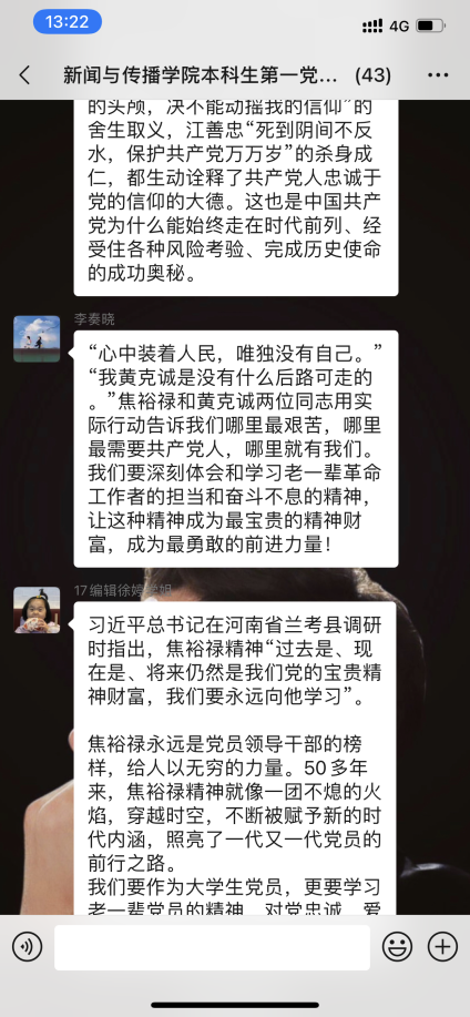 大家一致认为,通过学习党史来了解、体会像焦裕禄这样的优秀党员的伟大精神是必要且有价值的,曾经的艰苦岁月不应该在如今安稳幸福的生活中被忘记,通过了解中国共产党从发展到壮大的艰难旅程和学习老一辈共产党员不畏艰难、牺牲奉献、勇于斗争的崇高精神,大家进一步明确了党员恪守的初心和肩负的使命。作为共产党员,我们必须有焦裕禄同志一样的胸襟,一样的情怀,像焦裕禄同志一样,牢记全心全意为人民服务的宗旨,心系人民群众、团结人民群众、劳动人民群众,为改善民生、构建社会主义和谐社会奉献最大力量。